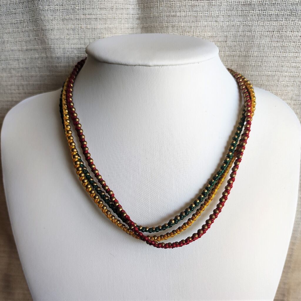グリーン、レッド、イエローの3色のラスタカラーのマクラメを使った3連のチョーカータイプのネックレスです。