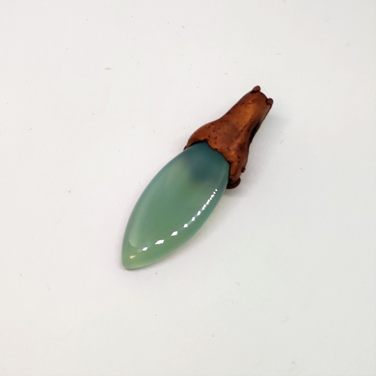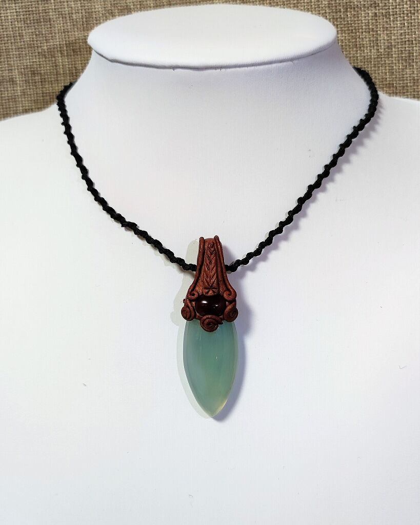 カルセドニーをメインにアゲートを使い、木粘土でペンダントトップを作成しました。ヘッドは、樹脂のような感じでしっかりとしています。