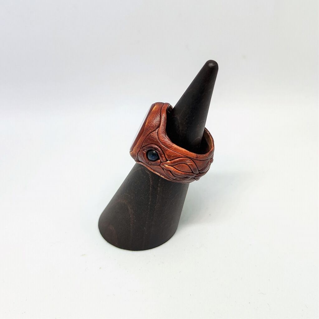 レッドオレンジ色のグラデーションが綺麗なレッドカーネリアン(赤縞瑪瑙)を使い、木粘土で指輪を作成しました。