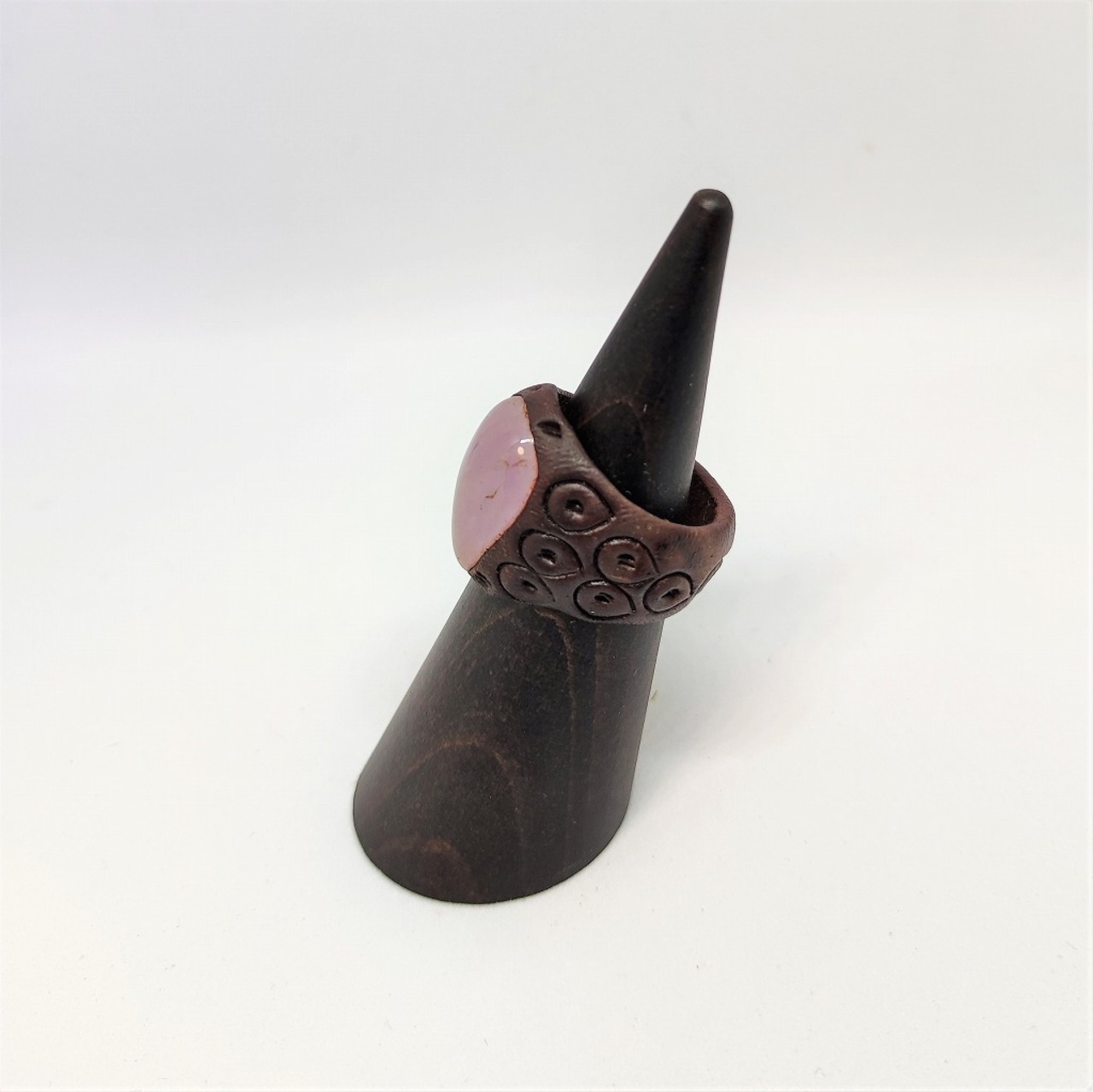 ローズクォーツを使い、木粘土で指輪を作成しました。