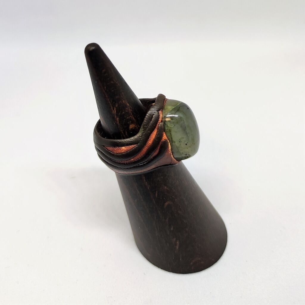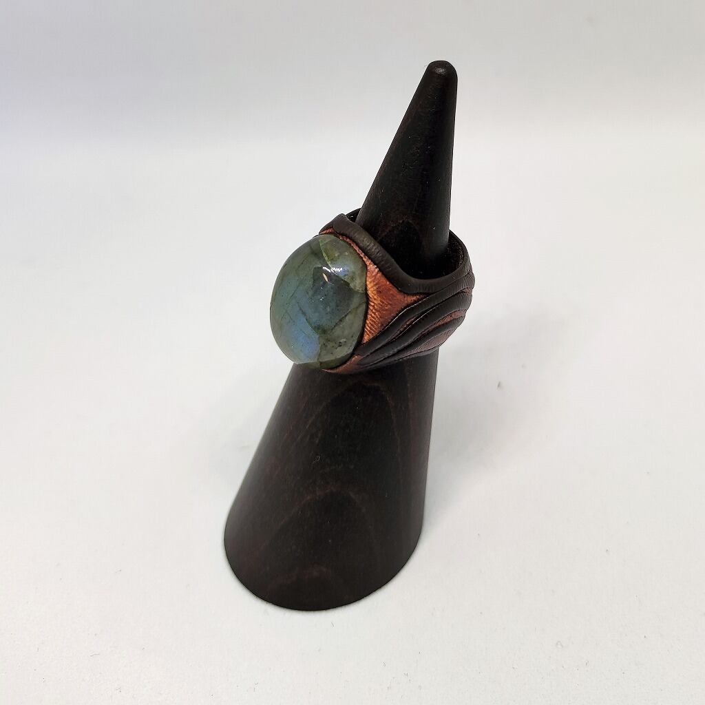 光の角度によって、色々な色合いが浮かぶ、神秘的なストーン、ラブラドライトを使い、木粘土で指輪を作成しました。