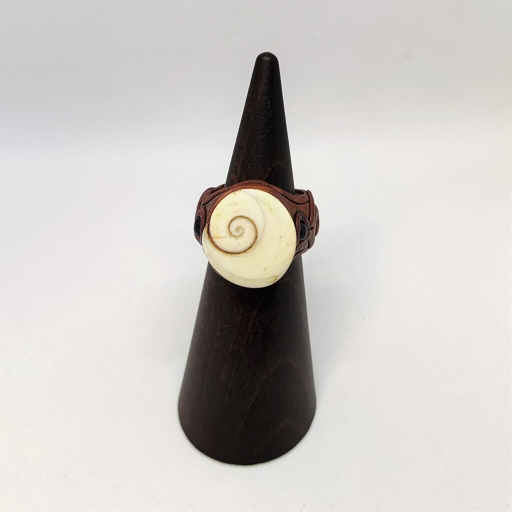 螺旋の模様が綺麗なインドの聖なる貝、シヴァアイとガーネットを使い、木粘土で指輪を作成しました。