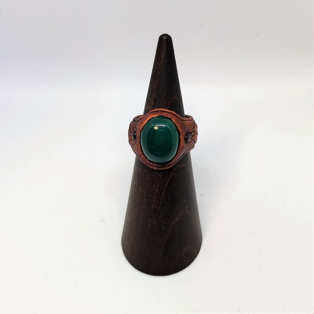鮮やかなグリーンオニキスとガーネットを使い、木粘土で指輪を作成しました。