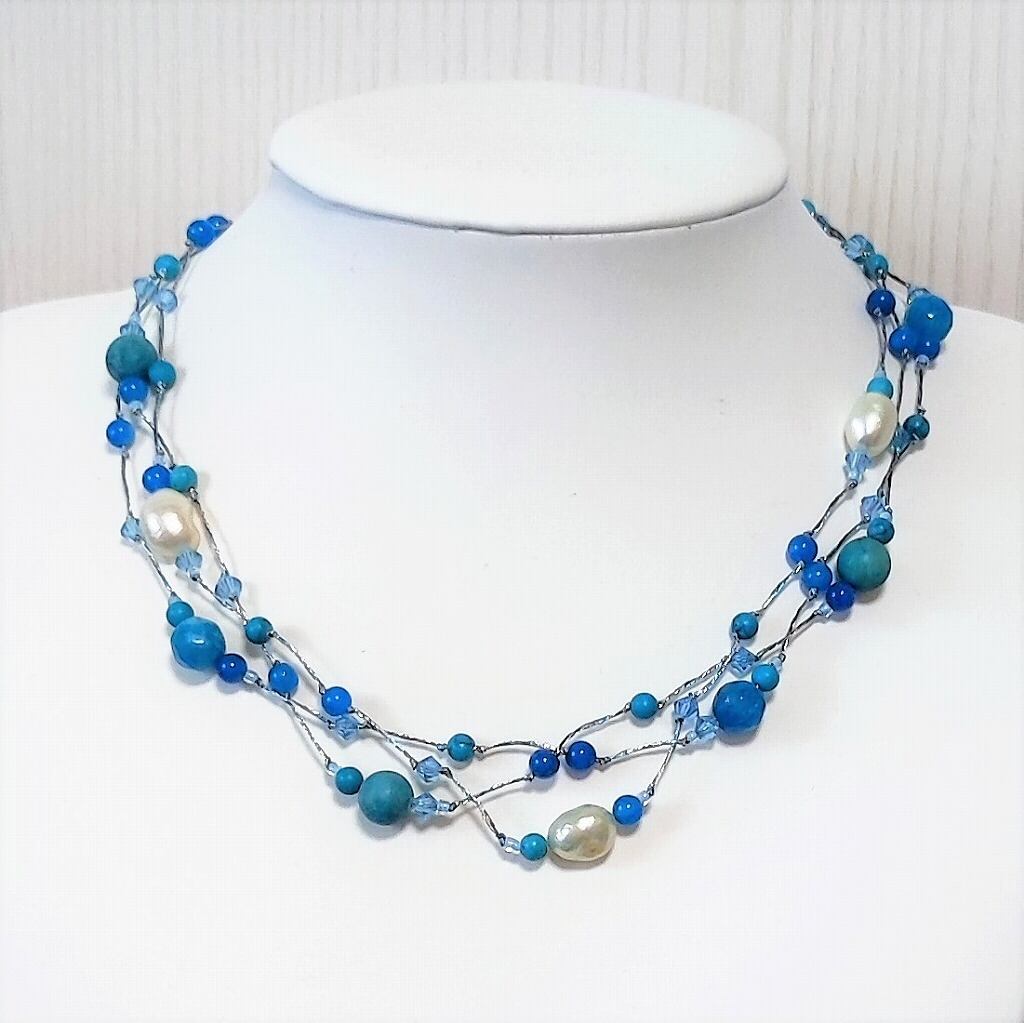 タイ産のシルクの生糸に大小様々なターコイズや淡水パール、アゲート、カットガラスを使った三連ネックレスです。