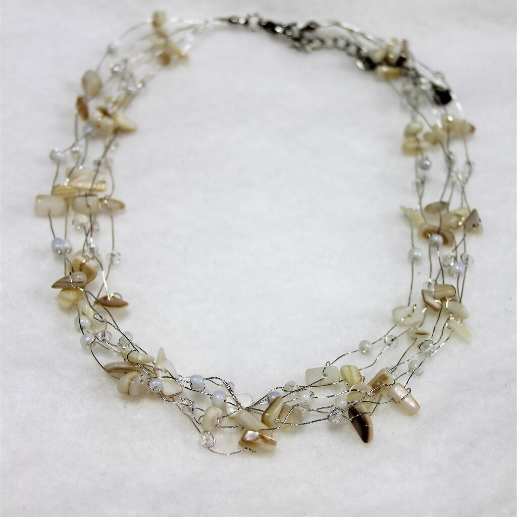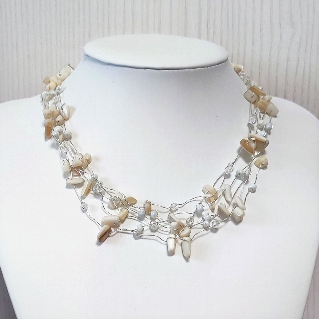 ラメシルバー糸にホワイトアゲートやカットガラスなどを使って作った六連ネックレスです。