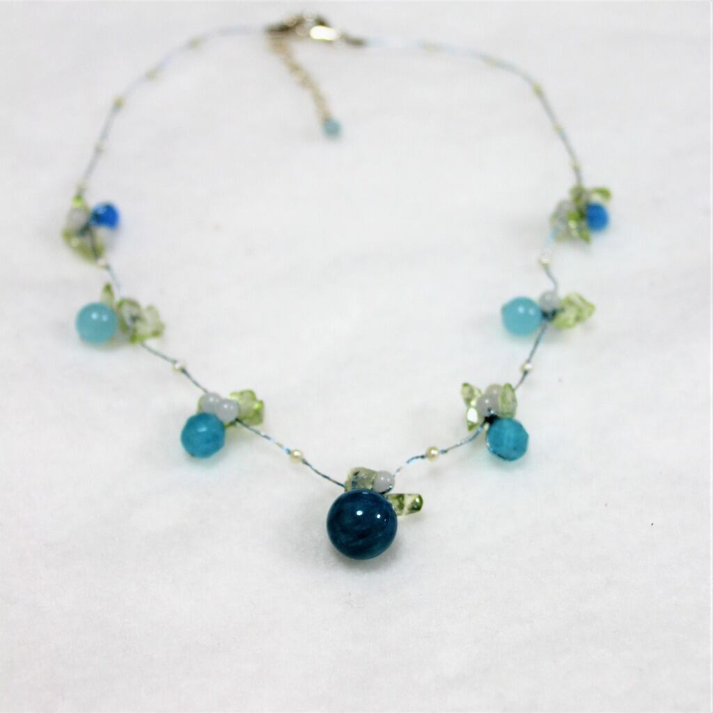 タイ産のシルク糸に大小様々なブルー系の天然石(アパタイト、カルセドニーetc)、淡水パールを使ったネックレスです。