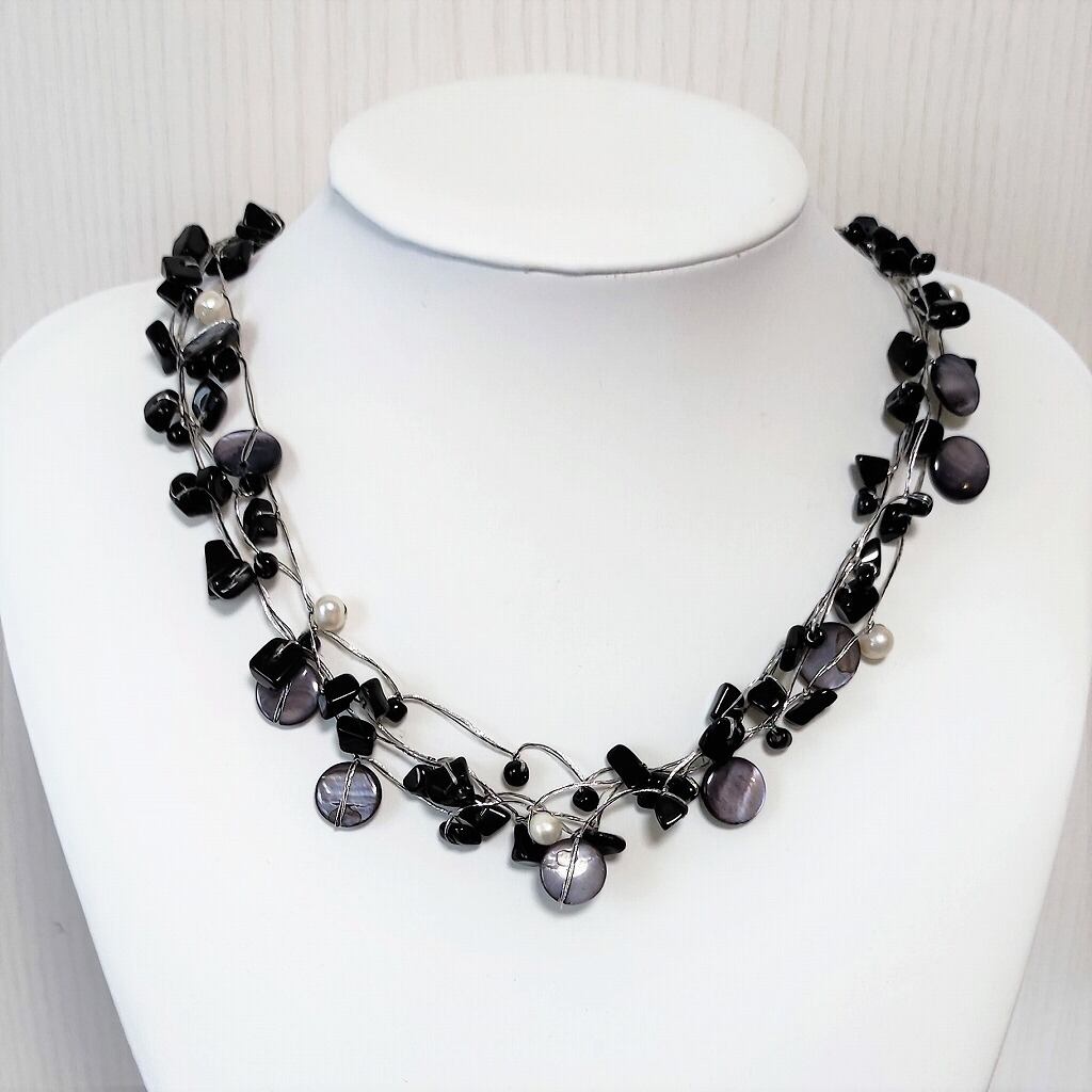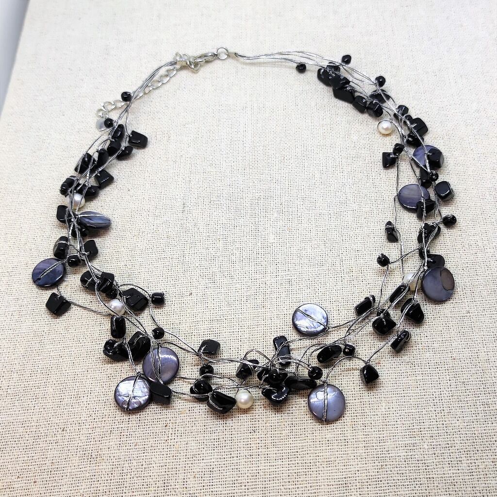 ラメシルバー糸に天然石、シェルビーズなどを使って作った4連のネックレスです。