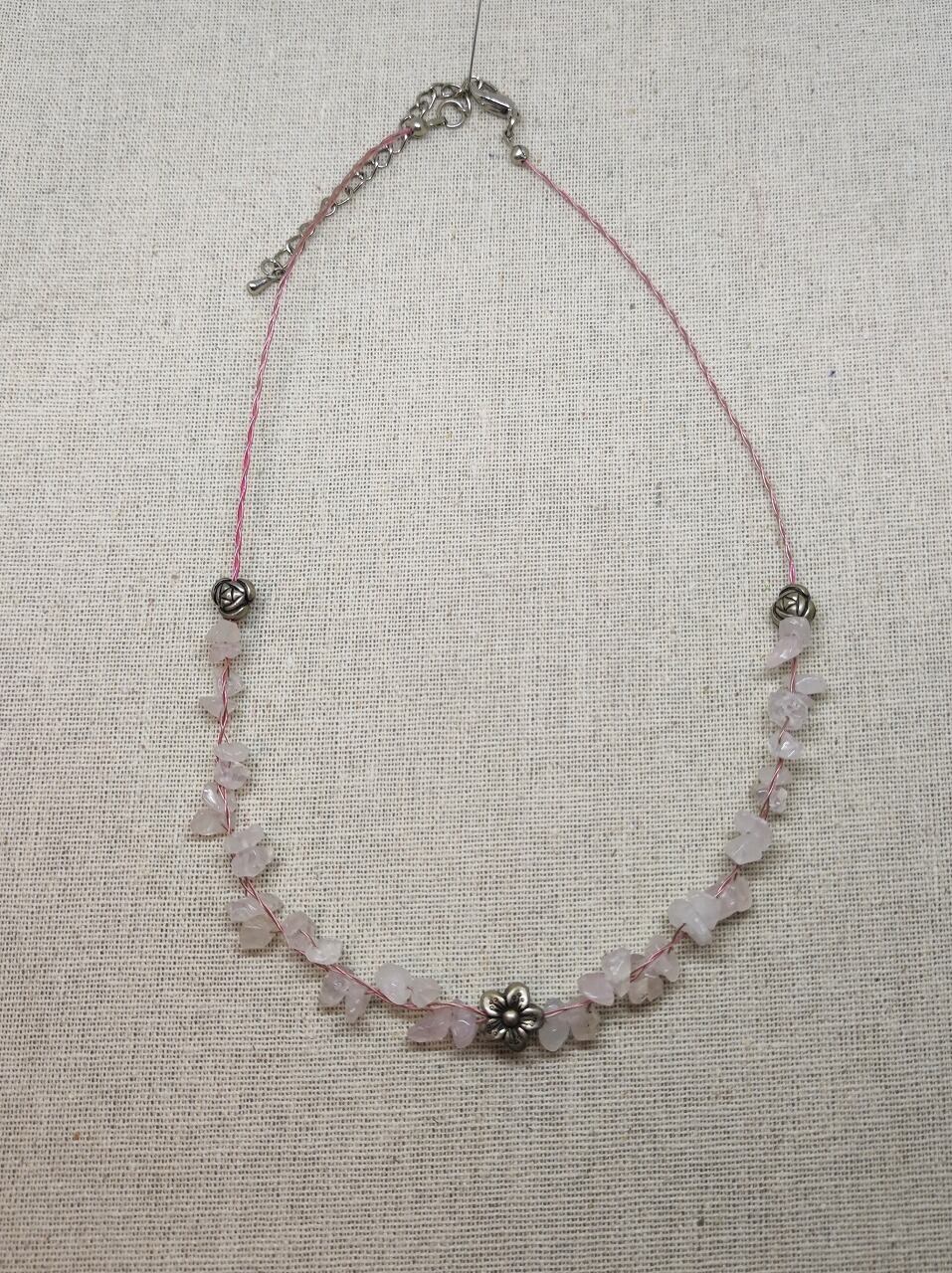 ローズクォーツの天然石とカレンシルバー風のフェイクビーズを組み合わせたネックレスです。