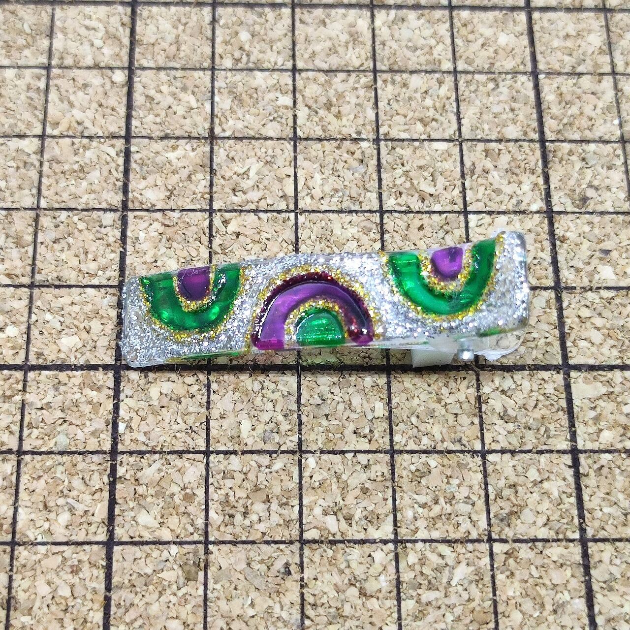 繊細なタッチで描かれたパープルとグリーンの文様が光にかざすとキラキラと輝いてとても美しいスクエア型のヘアクリップです。