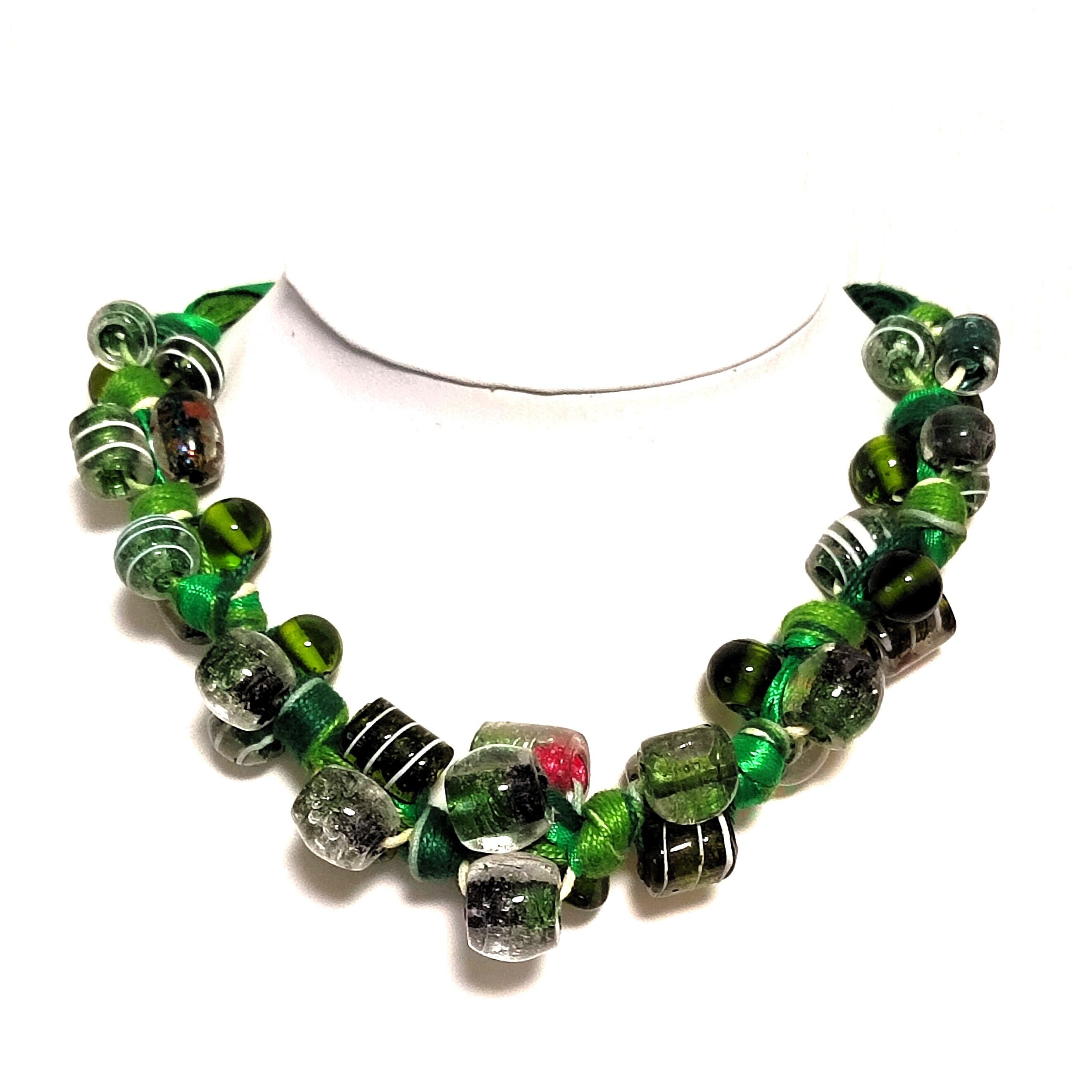インドで一つ一つ手作りされた様々な形のグリーンのガラスビーズを同色系のコットンヤーンとリボンでつなぎ合わせたチョーカータイプのネックレスです。